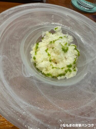まず1品目は、しゃりしゃりの氷の下に新鮮な魚が入っているお料理でした。パイナップルなども加えられ、色々な味が口の中で1つにまとまってとってもさっぱりしていて美味しかったです。